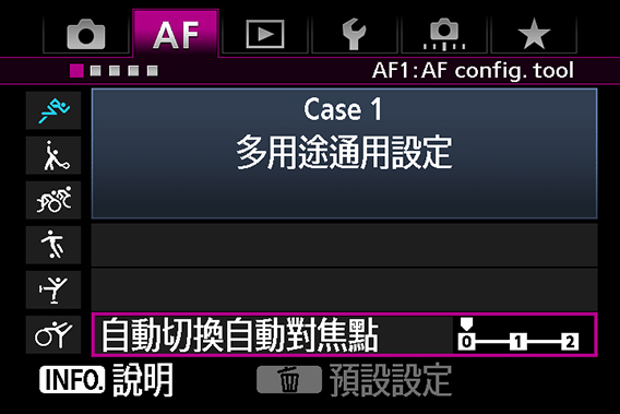 這是當主體上下左右大幅度移動時,設置自動對焦點切換速度的參數。因為它需在多個不同對焦點之間切換,所以自動對焦區域選擇模式設定為「單點自動對焦」或「單點重點自動對焦」模式時並不適用。