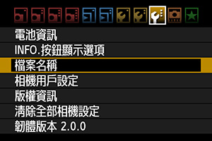 預設編碼是每一部EOS-1D X、EOS-1D C或EOS 5D Mark III出廠時預設的獨特檔案名稱,例如BE3B1234.CR2.。(EOS 7D的預設是「IMG_」) |