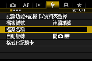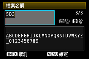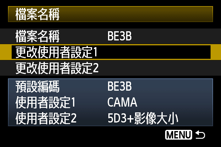 選擇「使用者設定1」以自訂檔案名稱,你可以自訂檔案的首4個字。 當你使用多部相機拍攝,可以將檔案名稱開端自訂為CAMA、CAMB等以方便複製至電腦後作識別。 |
