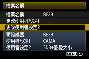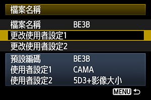 選擇「使用者設定2」,你可以自訂檔案名稱的首3個字,檔案的第4個字會自動加入以示影像大小。
