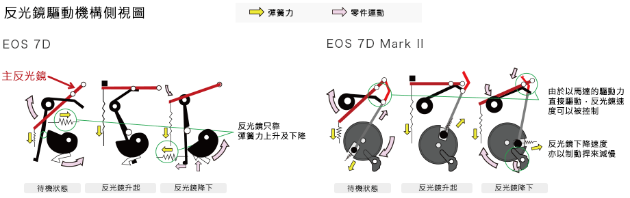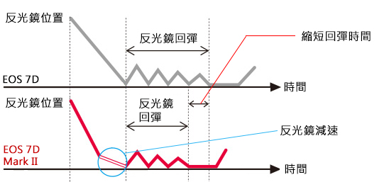 1. 以馬達驅動反光鏡的上升及下降(EOS 7D只採用彈簧控制反光鏡的升降),能在反光鏡撞擊反光鏡箱內壁的前一刻將其減速以降低衝擊力。