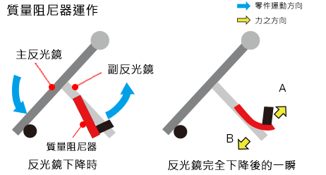 反光鏡完全降下後的一刻,衝擊力抵達副反光鏡,產生在B方向的力。但彈簧的彈性迫使質量阻尼器的重量繼續導向方向A。產生相反的作用力而抵消了動能,減少了震動。