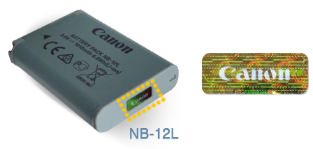 To help customers avoid purchasing counterfeit products, all Canon’s genuine lithium-ion battery packs are sold with a distinctive hologram label on the package (see below), which verifies their authenticity. When purchasing battery packs please refer to this information and check these security labels. (See the following images for the labels.) The security label is of a hologram that changes in pattern and color depending on the angle from which it is viewed and is difficult to imitate.