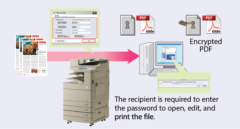 | User can set password when scanning so that unauthorized parties cannot open the file, enhancing document security. |